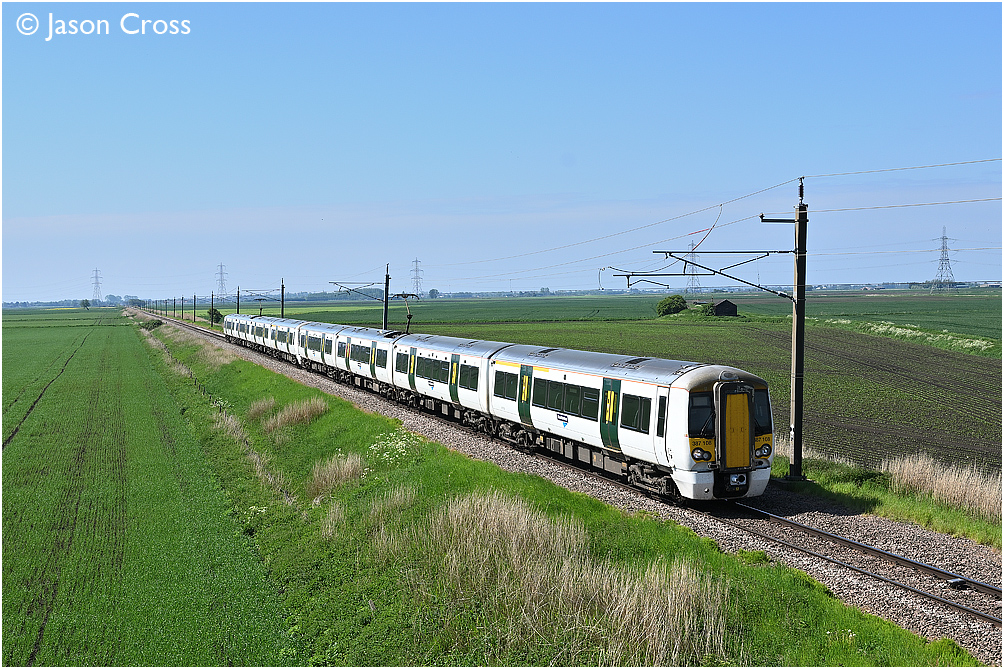 387108 and 387109 pass Black Horse Drove with the 1T14 0842 London Kings Cross to Kings Lynn. Date: 29 May 2021 Manipulation Notes: None Camera mounted on a tall pole and remotely fired