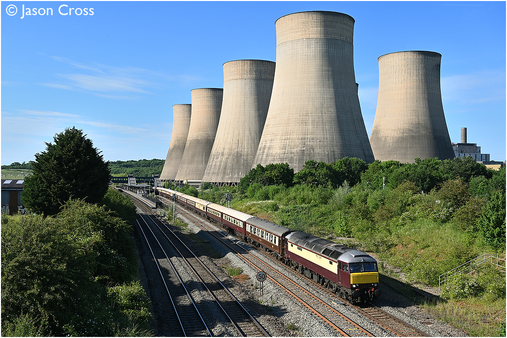 57601 passes Ratcliffe on Soar power station and East Midlands Parkway station with a 1Z75 1715 Chesterfield to Norwich Northern Belle railtour. Date: 15 June 2021 Manipulation Notes: None
