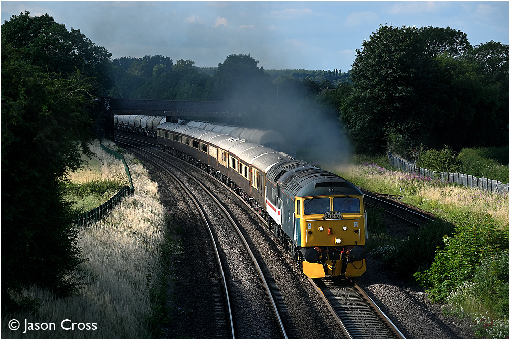 Having crossed from the slow to the fast at Syston South Junction, 47614 and 47828 get the power down through Thurmaston with a 1Z47 1520 Scarborough to St Albans railtour. Date: 10 July 2021 Manipulation Notes: None