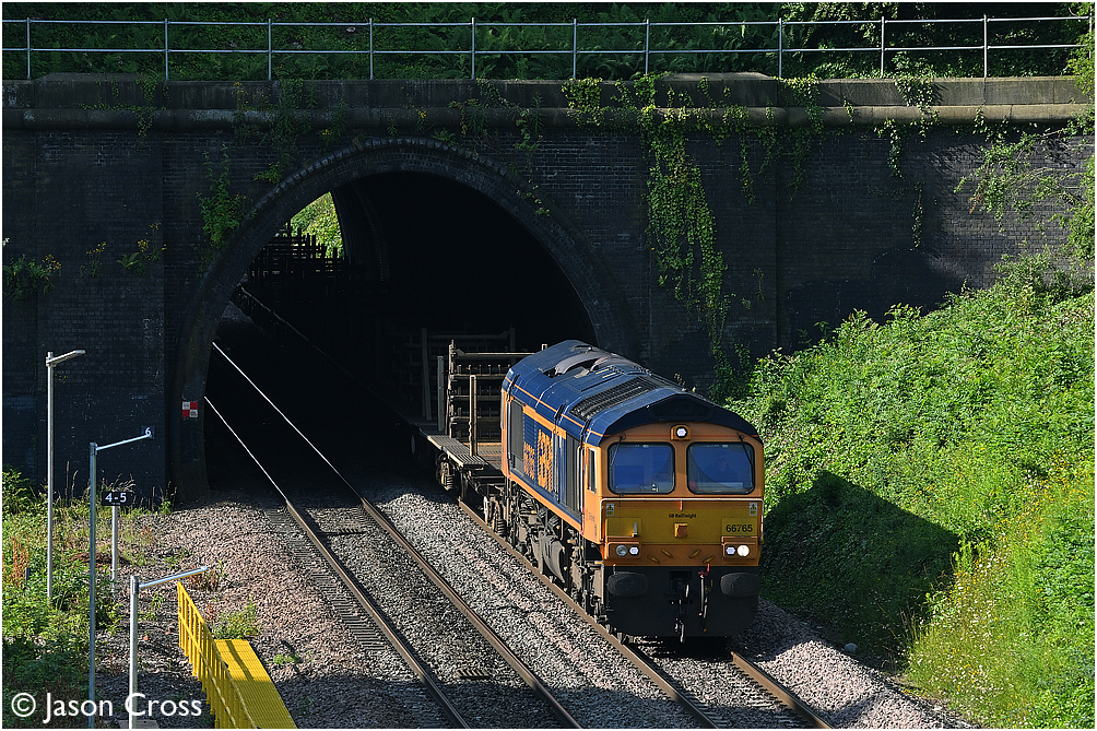 66765 emerges from the drakness of Knighton Tunnel as it approaches Leicester with a 6G35 Radlett Junction to Toton North Yard long welded rail train. Date: 11 July 2021 Manipulation Notes: None