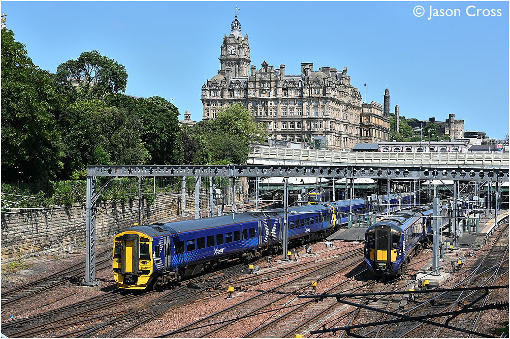 end of Edinburgh Waverley station. 158738, 158729 and 158731 are arriving with
