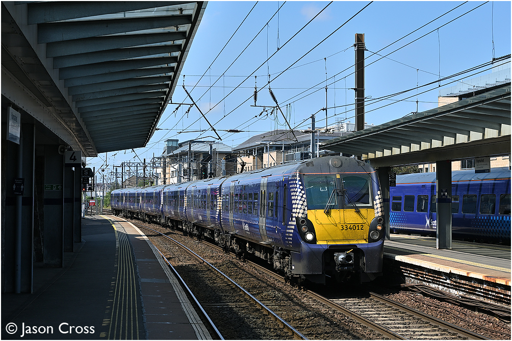 334012 and 334021 slow for the Haymarket stop while working the 2H48 0955 Helensburgh Central to Edinburgh. Date: 19 July 2021 Manipulation Notes: None