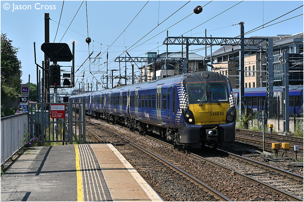 334030 and 334017 approach Haymarket with the 2H50 1025 Helensburgh Central to Edinburgh. Date: 19 July 2021 Manipulation Notes: None