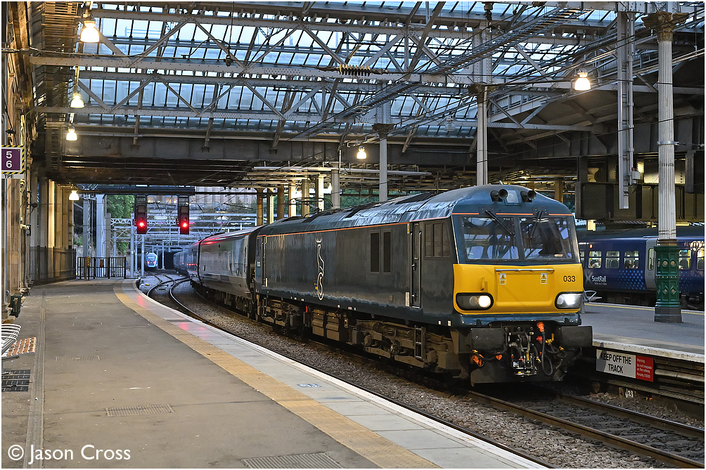 92033 arrives at Edinburgh Waverley with the 5C11 2044 Polmadie Depot to Edinburgh Caledonian Sleeper ECS. Date: 19 July 2021 Manipulation Notes: None