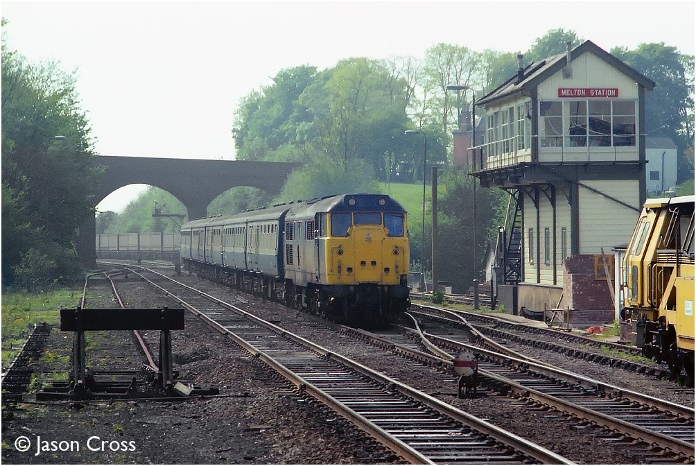 31439 slows for the Melton Mowbray station stop with the 1420 Birmingham New Street to Ipswich. Date: 7 May 1988