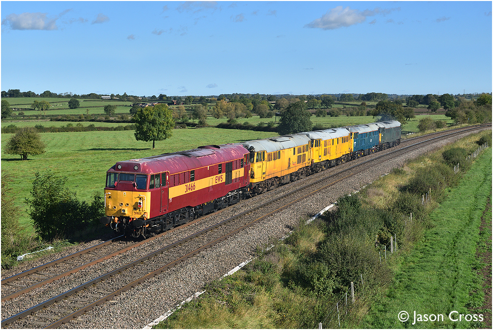 31466, 31285, 31465, 31459 and 31452 make their way to the Nene Valley Railway and are seen passing Rotherby as 0Z31. Date: 6 October 2017 Manipulation Notes: None Camera mounted on a tall pole and remotely fired