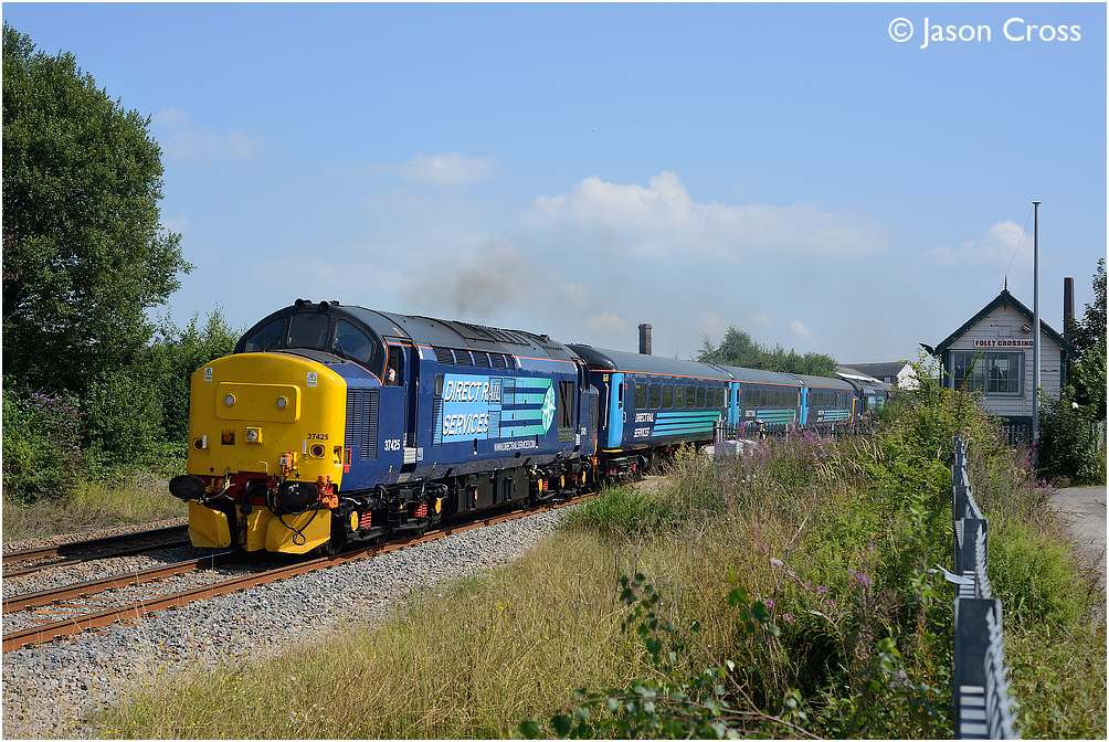 37425 leads a 5Z37 1348 Derby to Crewe ECS past Foley Crossing in Longton. Date: 26 August 2013 Manipulation Notes: None