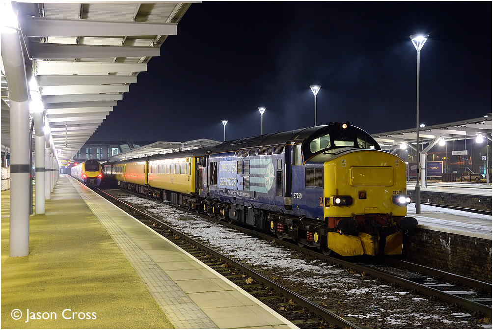37259 stands in Derby station with a 1Q28 1432 Derby RTC to Derby RTC (via London Euston) test train. Date: 30 December 2014 Manipulation Notes: None