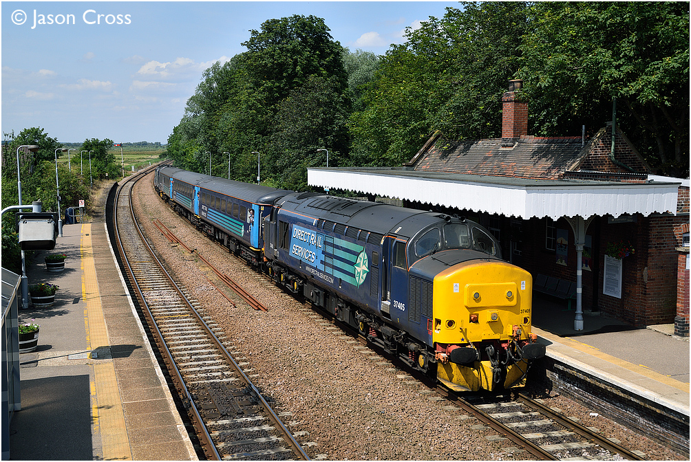 37405 passes through Reedham with the 2C58 1218 Norwich to Great Yarmouth service. Date: 11 July 2015 Manipulation Notes: None