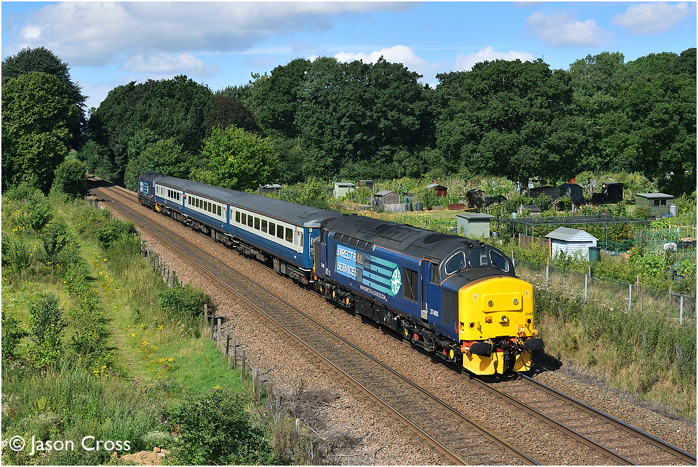37405 slows for the Brundall Gardens stop while working the 2P18 1036 Norwich to Great Yarmouth service. Date: 1 August 2017 Manipulation Notes: None Camera mounted on a tall pole and remotely fired