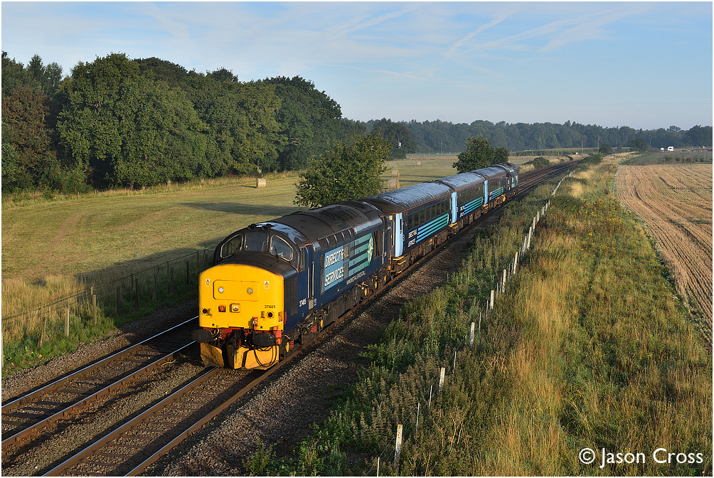 37405 approaches Buckenham with the 5J67 Norwich to Lowestoft empty stock working. Date: 28 August 2017 Manipulation Notes: None Camera mounted on a tall pole and remotely fired