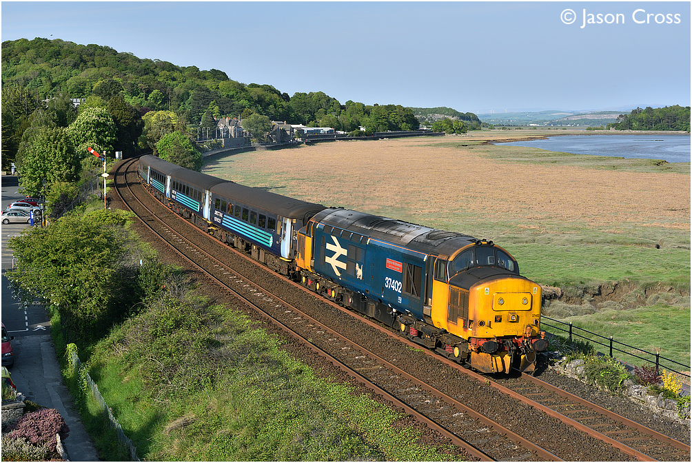 37402 departs from Grange-over-Sands at the head of the 2C31 1731 Lancaster to Barrow-in-Furness. Date: 19 May 2018 Manipulation Notes: None Camera mounted on a tall pole and remotely fired