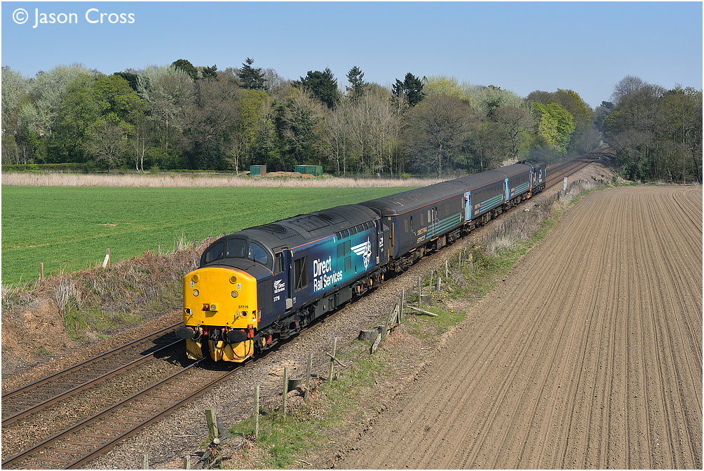 37716 is captured shortly after leaving Brundall Gardens with the 2P21 1317 Great Yarmouth to Norwich. Date: 19 April 2019 Manipulation Notes: None Camera mounted on a tall pole and remotely fired