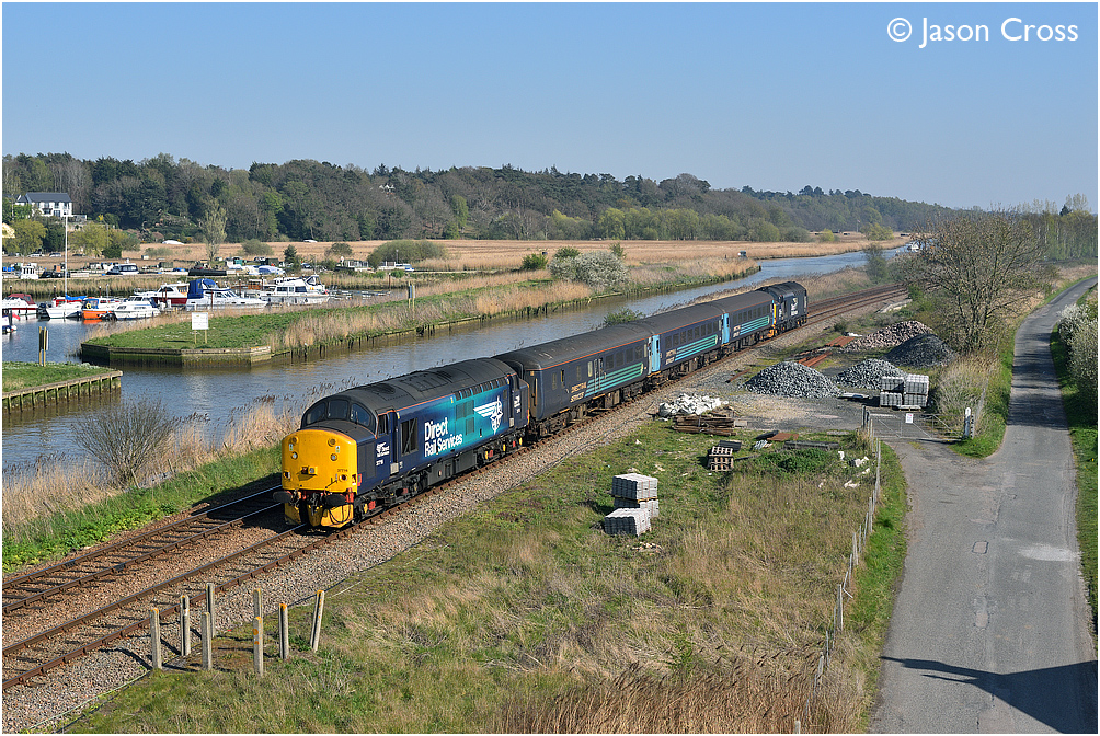 37716 and 37423 depart from Haddiscoe with 2J83 1548 Lowestoft to Norwich. Date: 19 April 2019 Manipulation Notes: None