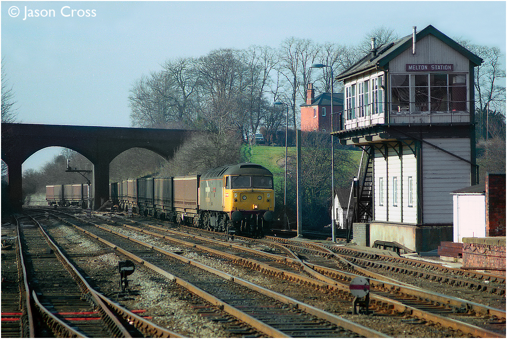 47337 'Herbert Austin' waits to depart from Melton Mowbray yard's headshunt with a rake of 'Petliner' container wagons. This loco later became 57602. Date: 19 February 1987