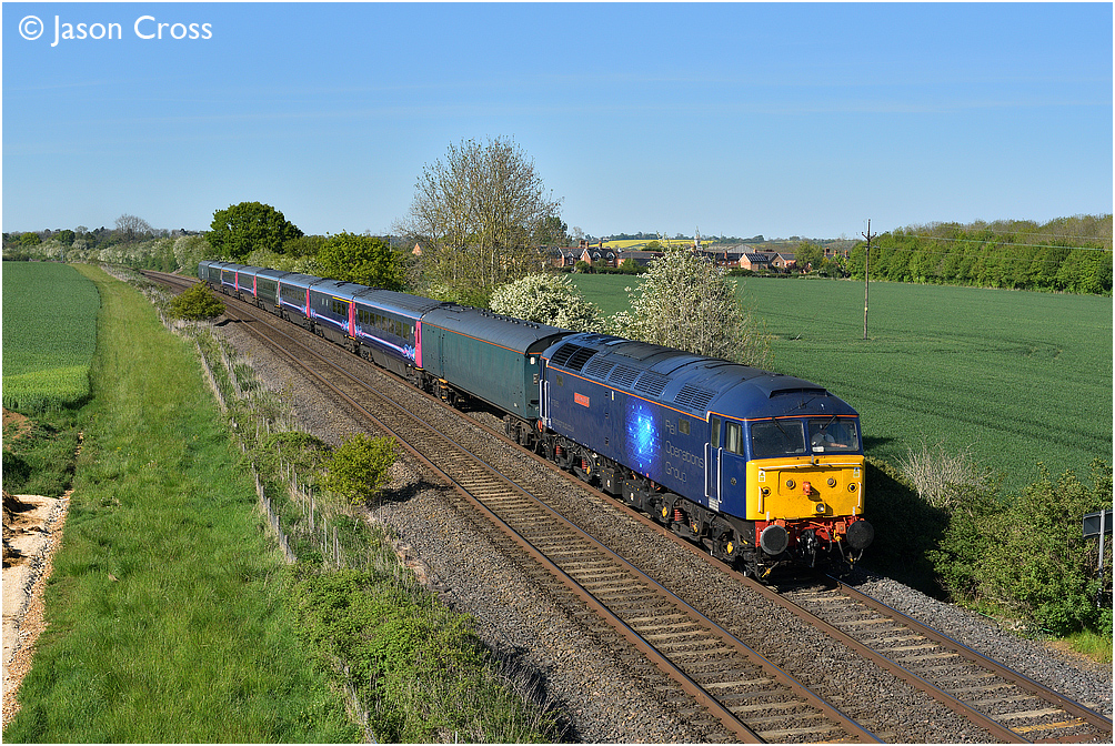 47815 approaches Langham Junction at the head of a train of redundant HST stock running as 5L46 0935 Laira T&RSMD to Ely. Date: 15 May 2019 Manipulation Notes: None Camera mounted on a tall pole and remotely fired