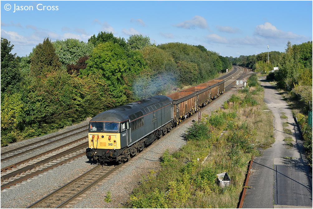 56312 powers away from Syston South Junction with a 6Z21 0959 Chaddesden Sidings to Leicester wagon move. Date: 9 October 2016 Manipulation Notes: None Camera mounted on a tall pole and remotely fired