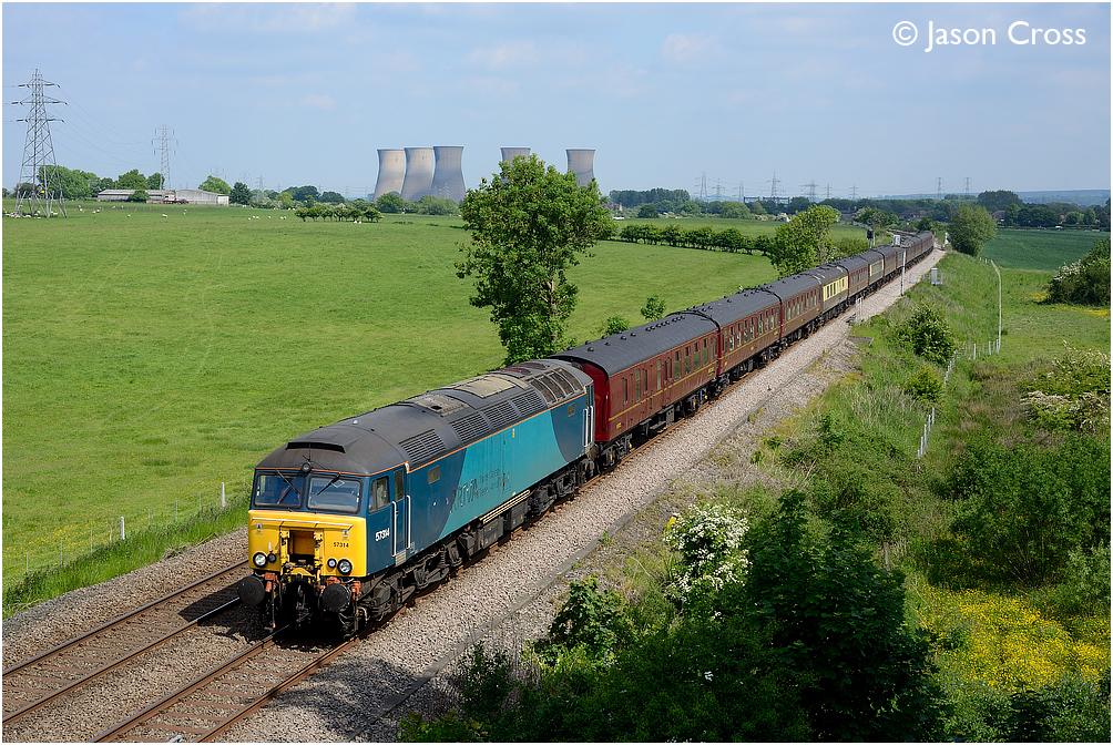 Before being painted in 'doom maroon', 57314 looks a little untidy at the head of a 5Z38 1455 Derby to Carnforth ECS at Willington. Date: 9 June 2013 Manipulation Notes: None