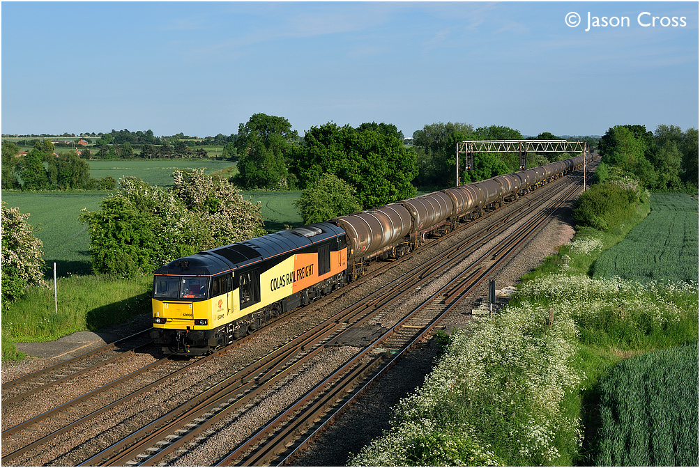 60096 approaches Sileby with the 6E38 Colnbrook to Lindsey empty oil tanks. Date: 6 June 2016 Manipulation Notes: None Camera mounted on a tall pole and remotely fired