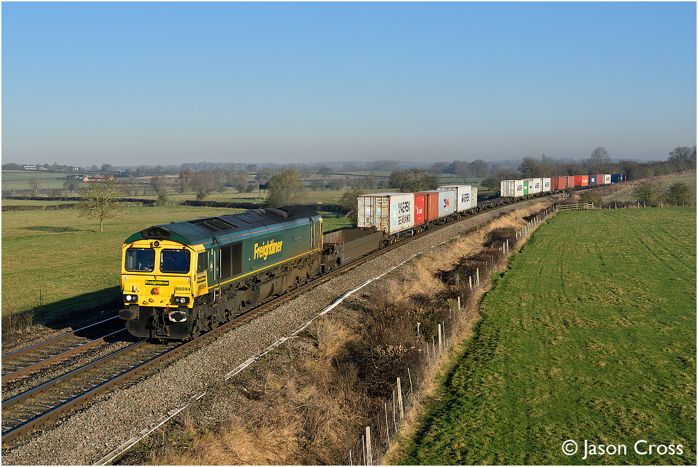 66594 passes Rotherby with a 4M94 0739 Felixstowe South to Lawley Street container train. Date: 29 December 2016 Manipulation Notes: None Camera mounted on a tall pole and remotely fired