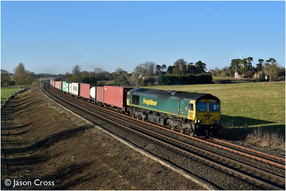 66588 passes Brentingby near Melton Mowbray with the 4L93 Lawley Street to Felixstowe container train. Date: 5 January 2017 Manipulation Notes: None Camera mounted on a tall pole and remotely fired