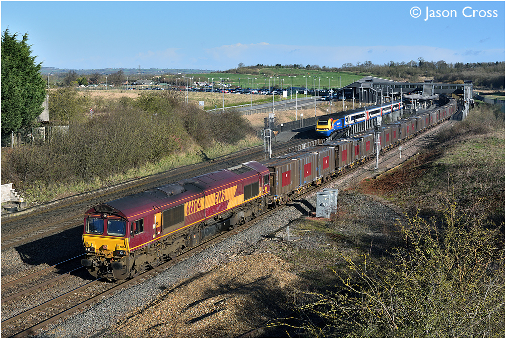 66104 passes East Midlands Parkway with the 6M82 0557 Milford West Sidings to Hotchley Hill gypsum containers. Date: 21 March 2017 Manipulation Notes: None Camera mounted on a tall pole and remotely fired