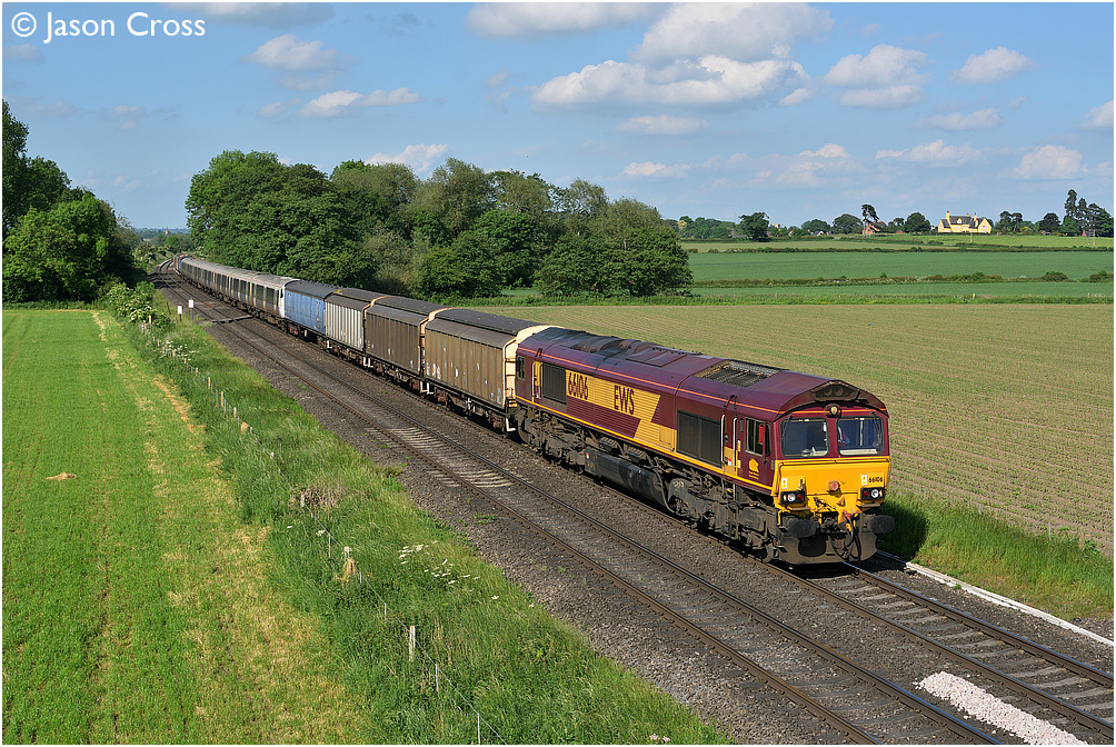 66106 passes East Goscote with a 7X40 1315 Asfordby Test Centre to Crewe Carriage Sidings EMU drag (345001). Date: 31 May 2017 Manipulation Notes: None Camera mounted on a tall pole and remotely fired