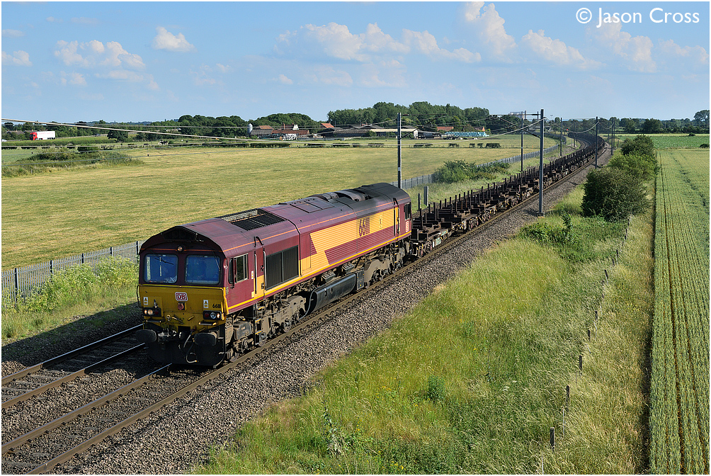 66111 passes North Muskham with the 4E32 Dollands Moor to Scunthorpe steel empties. Date: 18 June 2017 Manipulation Notes: None Camera mounted on a tall pole and remotely fired