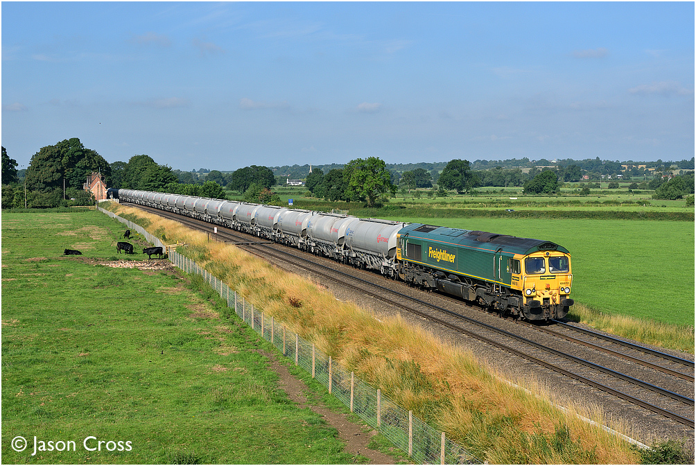 66610 passes Rearsby with the Tunstead to West Thurrock cement train. Date: 7 July 2017 Manipulation Notes: None Camera mounted on a tall pole and remotely fired