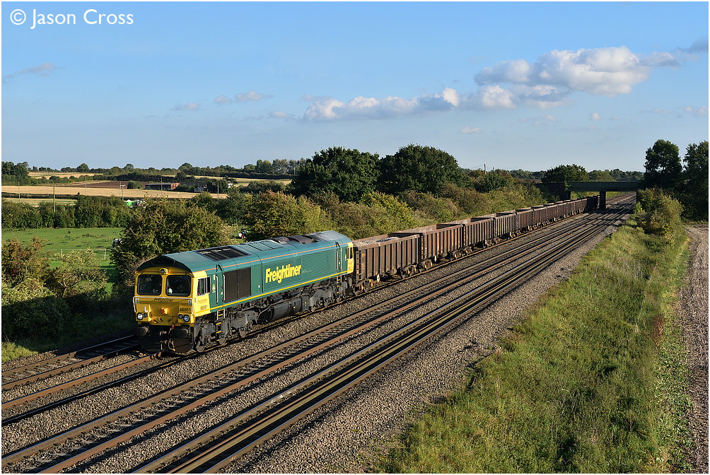 66951 passes Cossington with the 6Z67 Trowse Yard to Tunstead Sidings stone empties. Date: 19 September 2017 Manipulation Notes: None Camera mounted on a tall pole and remotely fired