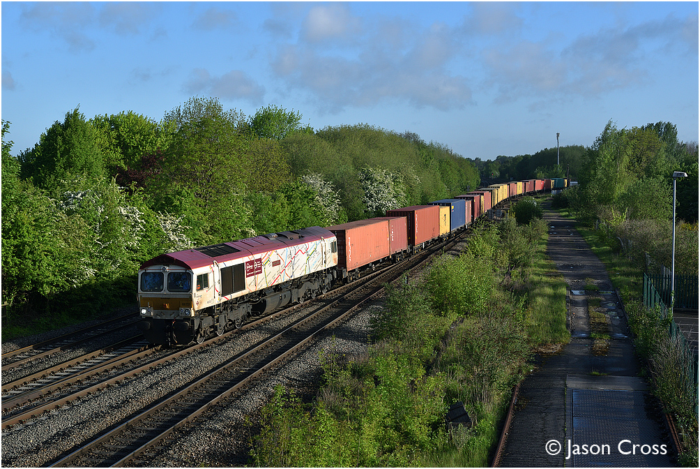 66721 'Harry Beck' crosses Syston South Junction with 4M06 Felixstowe South to Hams Hall. Date: 10 May 2018 Manipulation Notes: None Camera mounted on a tall pole and remotely fired