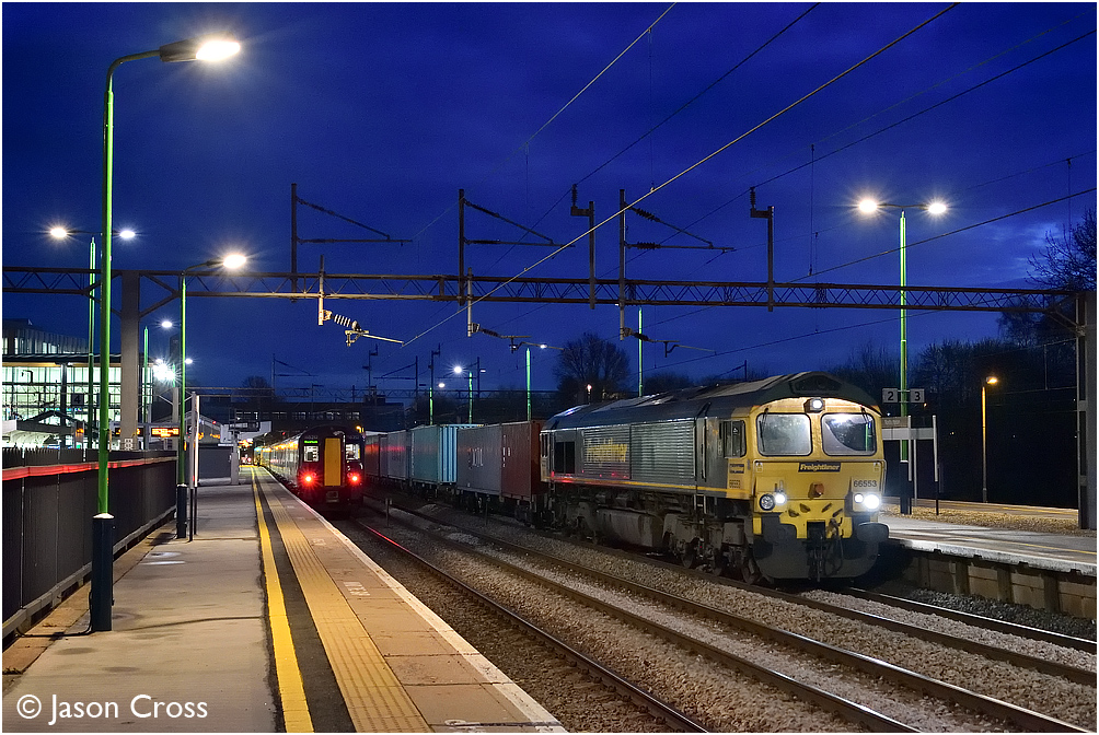66553 passes through Northampton with 4M56 1257 London Gateway to Garston Freightliner Terminal. Date: 20 February 2019 Manipulation Notes: None