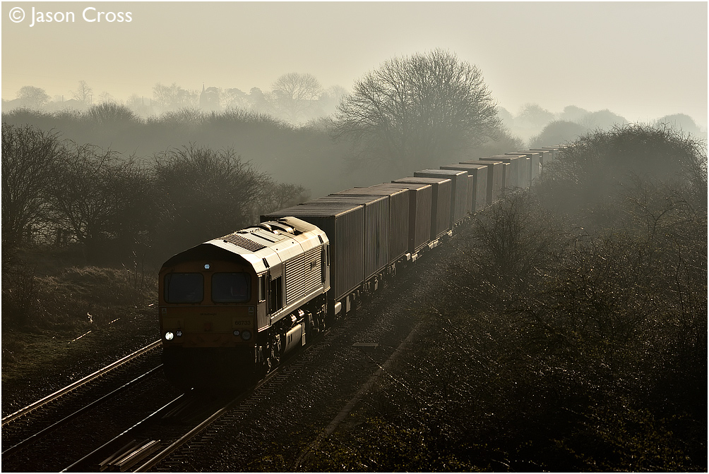 66733 approaches Melton Mowbray at first light with the 4M21 0310 Felixstowe North to Trafford Pk Euro Terminal container train. Date: 26 March 2019 Manipulation Notes: None