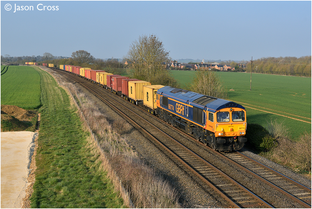 66774 approaches Langham Junction with the 4L22 1435 Hams Hall to Felixstowe South container train. Date: 29 March 2019 Manipulation Notes: None Camera mounted on a tall pole and remotely fired