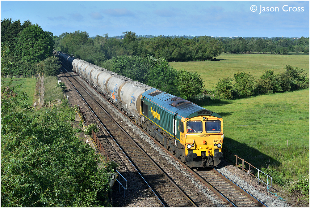 66613 approaches the Syston bypass bridge with the 6L44 Tunstead to West Thurrock cement tanks. Date: 16 June 2019 Manipulation Notes: None