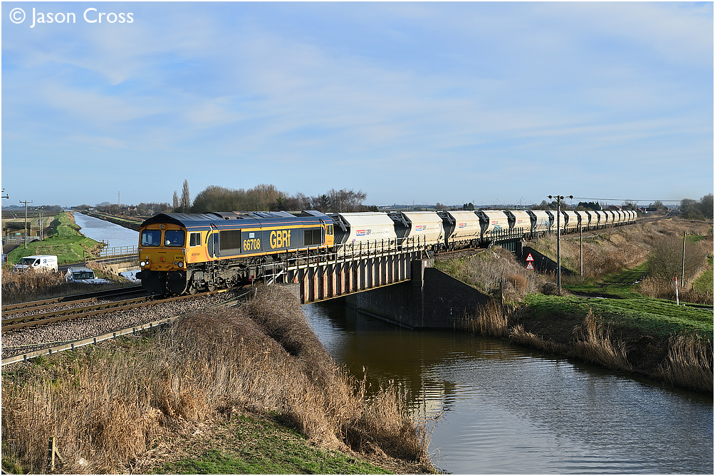66708 crosses Beggar's Bridge near Whittlesea with the 6E63 Middleton Towers to Monk Bretton sand hoppers. Date: 31 December 2019 Manipulation Notes: None Camera mounted on a tall pole and remotely fired