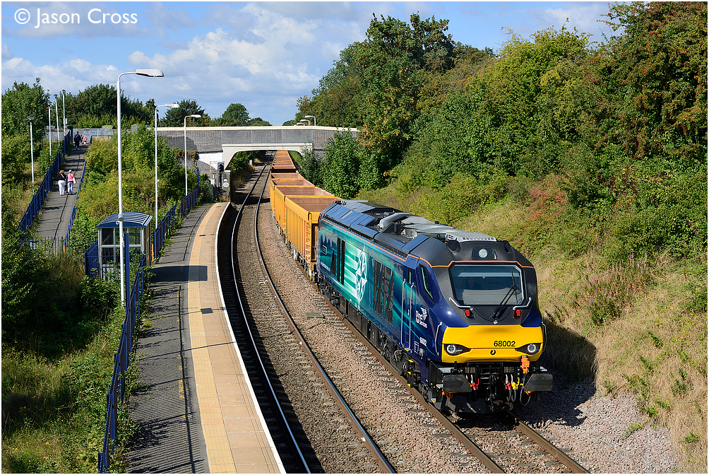 68002 passes through South Wigston station with the 6U76 0859 Crewe Basford Hall to Mountsorrel sidings stone empties. Date: 21 August 2014 Manipulation Notes: None Camera mounted on a tall pole and remotely fired