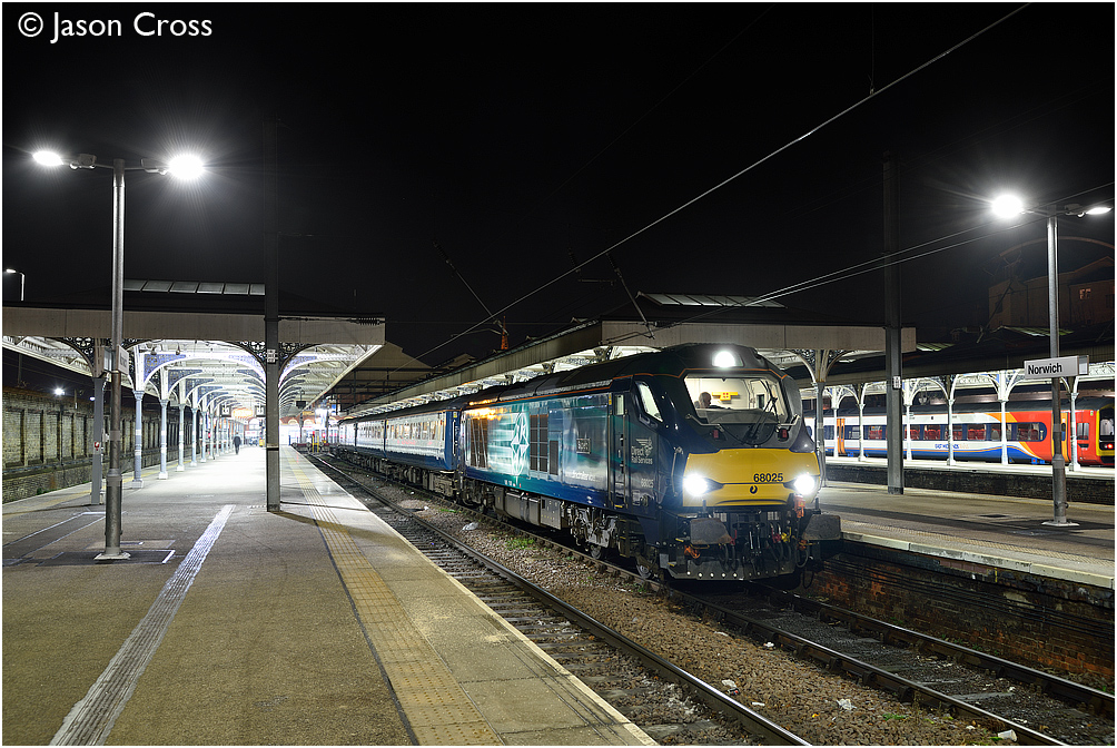 68025 waits in Norwich's platform 3 with the 2P40 2040 Norwich to Great Yarmouth. Date: 27 December 2016 Manipulation Notes: None