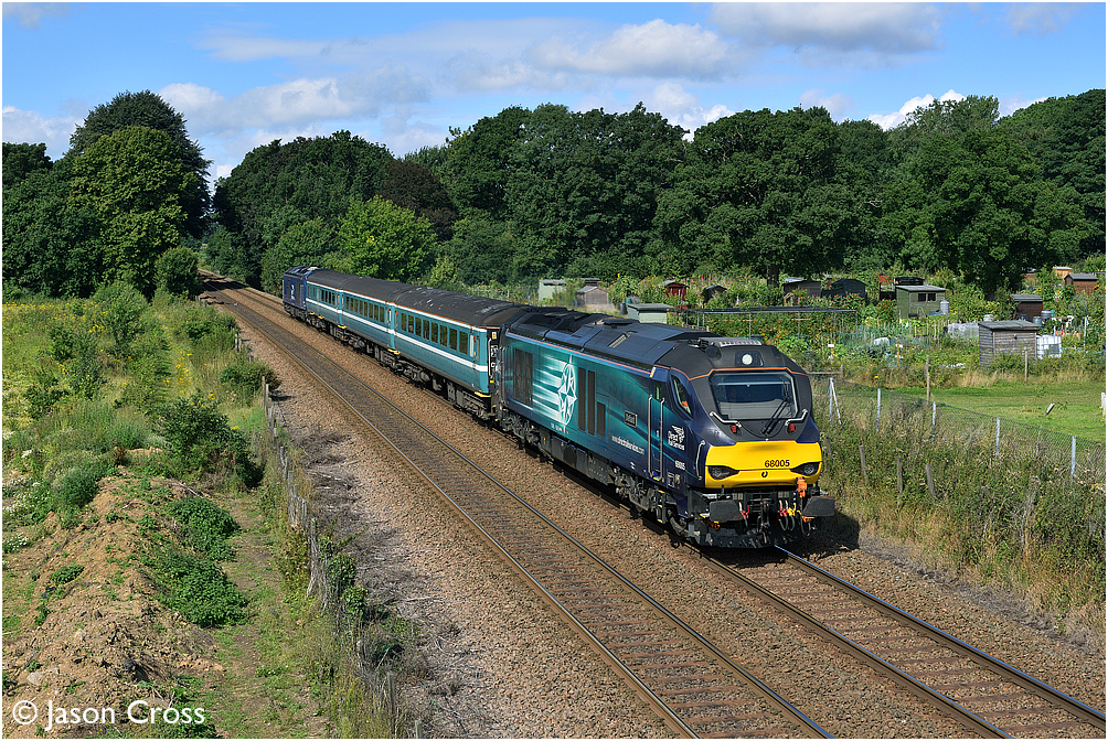 68005 powers through Brundall Gardens with the 2J70 1005 Norwich to Lowestoft service. Date: 1 August 2017 Manipulation Notes: None Camera mounted on a tall pole and remotely fired