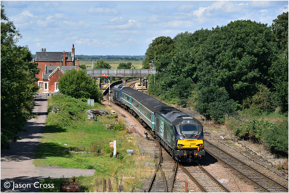 68005 is seen on the rear of the 2J73 1057 Lowestoft to Norwich service as the train approaches Reedham hauled by 68028. Date: 1 August 2017 Manipulation Notes: None