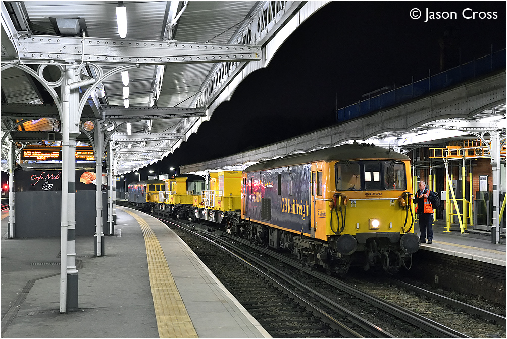 73109 leads a 3Y90 snow and ice train and is pausing for a crew change at Purley. Date: 16 February 2019 Manipulation Notes: None