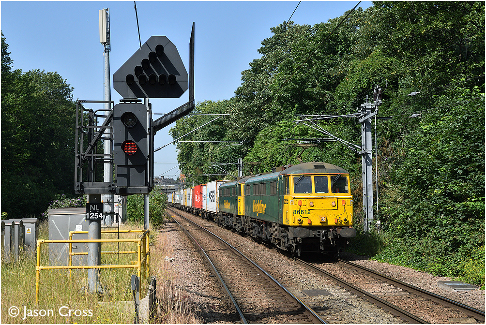 86612 and 86604 approach Canonbury with the 4L89 Coatbridge to Ipswich container train. Date: 29 June 2019 Manipulation Notes: None