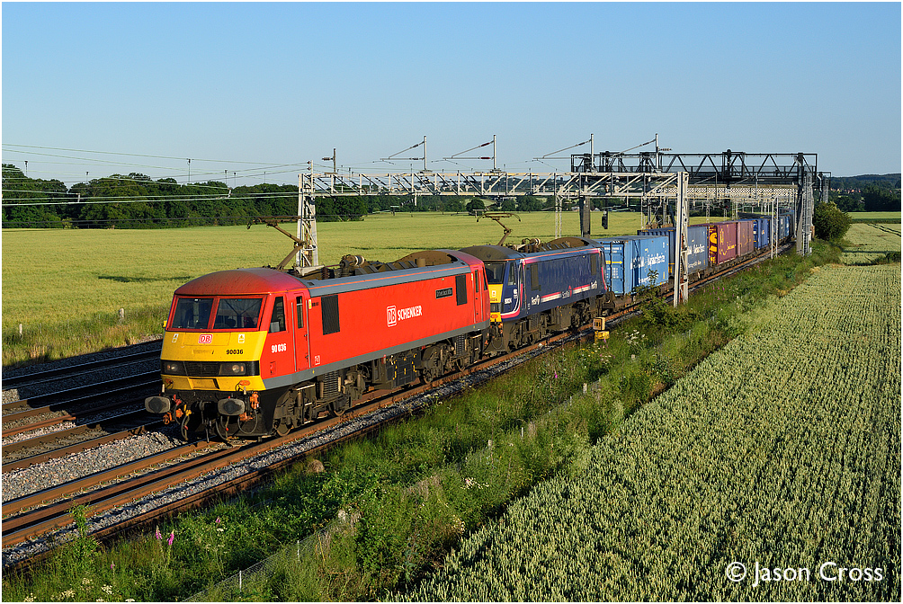 90036 and 90024 pass Grendon Bridge with the 4S47 1913 Daventry International Rail Freight Terminal to Mossend Yard. Date: 30 June 2015 Manipulation Notes: None Camera mounted on a tall pole and remotely fired
