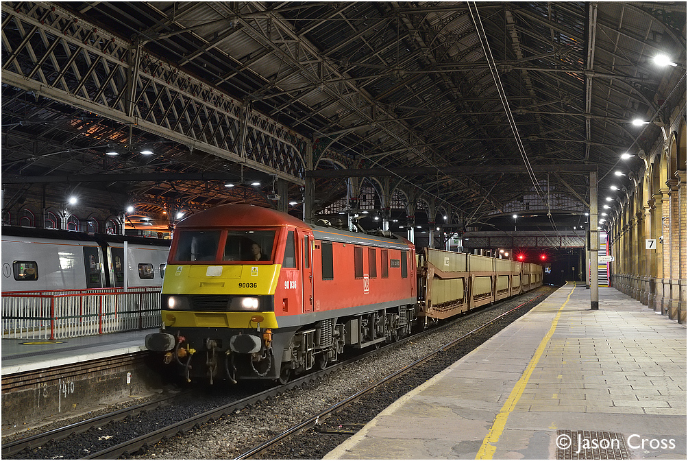 90036 passes through Preston at the head of the 6L35 1739 Mossend Down Yard to Dagenham Dock Reception. Date: 26 October 2018 Manipulation Notes: None