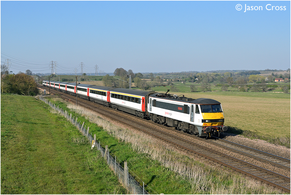 90001 passes Dunston at the head of the 1P55 1700 Norwich to London Liverpool Street service. Date: 19 April 2019 Manipulation Notes: None Camera mounted on a tall pole and remotely fired