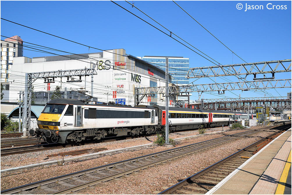 90009 pushes north into Stratford with a London Liverpool Street to Ipswich service. Date: 21 September 2019 Manipulation Notes: None