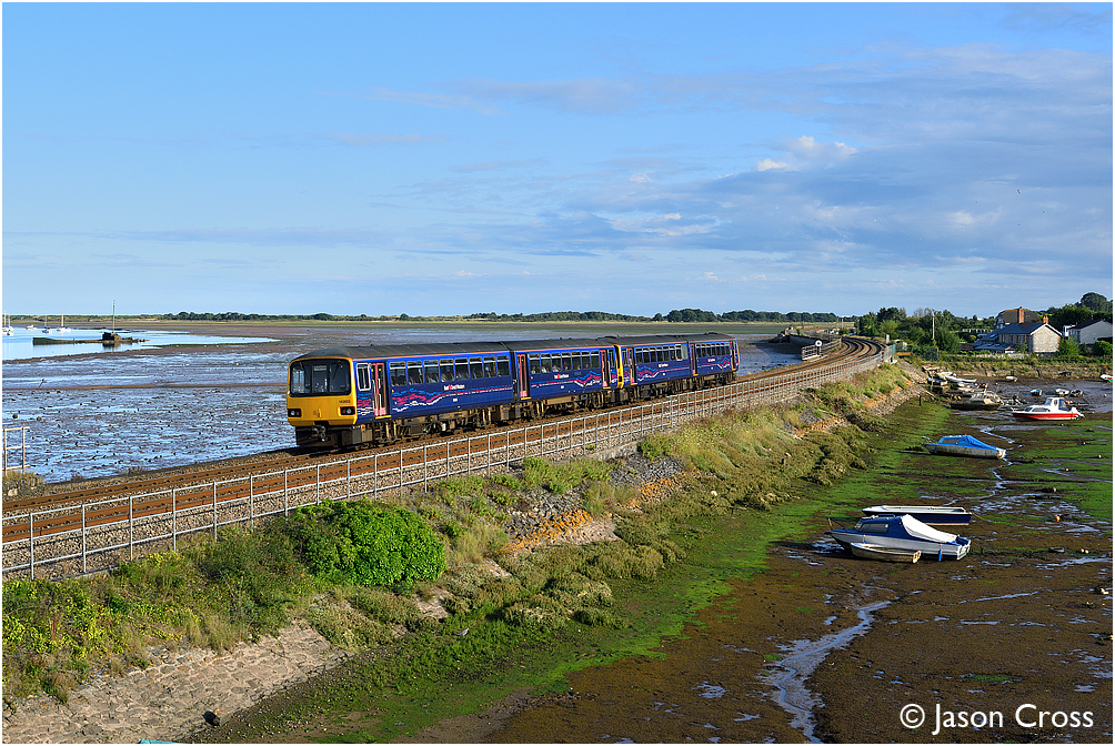 143603 and 143619 pass Cockwood Harbour while working the 2T26 1801 Exmouth to Paignton service. Date: 7 August 2015 Manipulation Notes: None Camera mounted on a tall pole and remotely fired