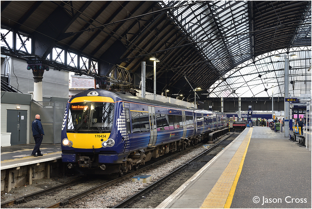 170434 waits to depart from Glasgow Queen Street with the 2J78 1824 to Falkirk Grahamston. Date: 14 August 2018 Manipulation Notes: None