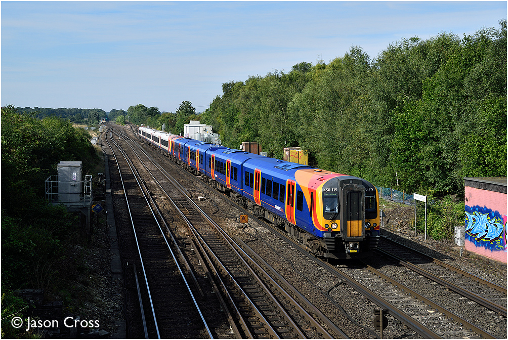 450119 and an unidentified 444 pass Worting Junction with the 1W06 0803 Weymouth to London Waterloo. Date: 22 August 2015 Manipulation Notes: None