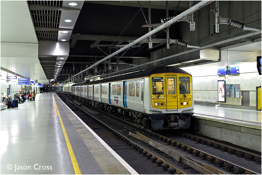 319422 waits to depart from St Pancras International Thameslink with the 1G62 2134 St Pancras International to Bedford. Date: 20 February 2016 Manipulation Notes: None
